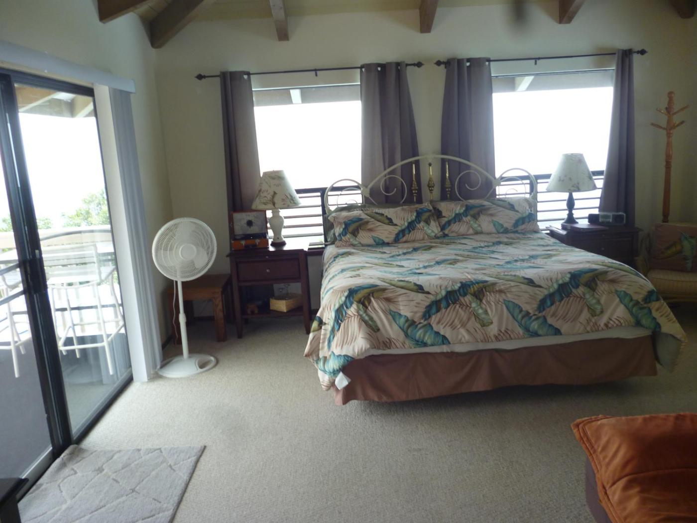 King Room with Ocean View. Room features a TV, a refrigerator, a sofa bed and a futon. Room is referred to as the Pacific Room and opens on the long lanai patio which wraps around the back of the house looking out to the ocean.