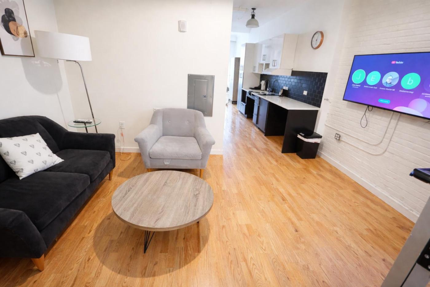 One-Bedroom Loft Apartment with One Queen Bed. Featuring a private entrance, this air-conditioned apartment comprises 1 living room, 1 separate bedroom and 1 bathroom with a shower and a hairdryer. Meals can be prepared in the kitchenette, which comes with a stovetop, a refrigerator, kitchenware and a microwave. The apartment provides a flat-screen TV with streaming services, a seating area, a wardrobe, an electric kettle as well as city views. The unit offers 1 bed.