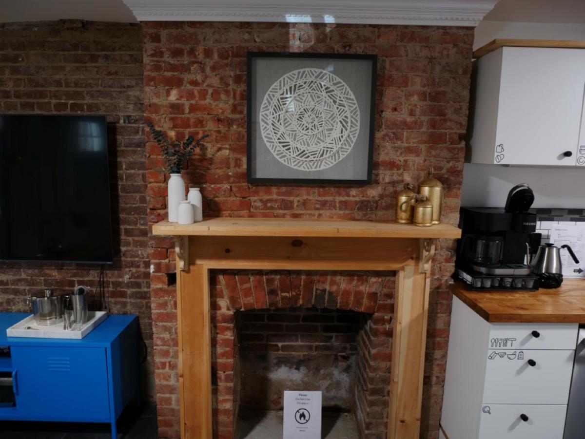 Guests can relax near the outdoor fireplace at the apartment.